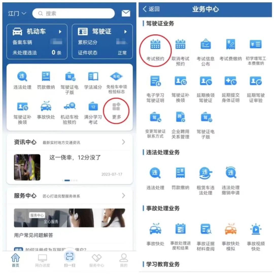 注册登录“交管12123”,在首页点击【更多】,在“业务中心-驾驶证业务”栏中点击【考试预约】,填写资料办理。
