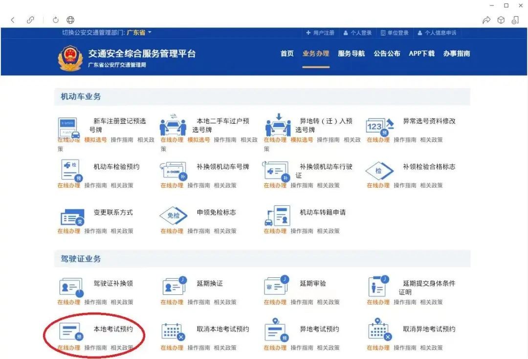 注册登录交通安全综合服务管理平台(gd.122.gov.cn),在首页点击【业务办理】,在“驾驶证业务”栏中点击【本地考试预约】,填写资料办理。