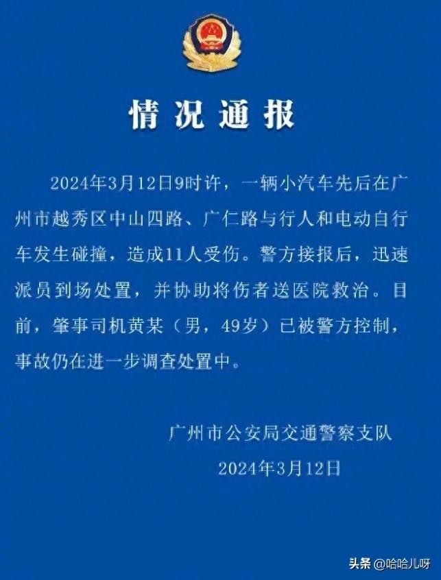 ︎▶︎︎▶︎广州市公安局交通警察支队通报来了:2024年3月12日9时许,一辆小汽车先后在广州市越秀区中山四路、广仁路与行人和电动自行车发生碰撞,造成11人受伤。