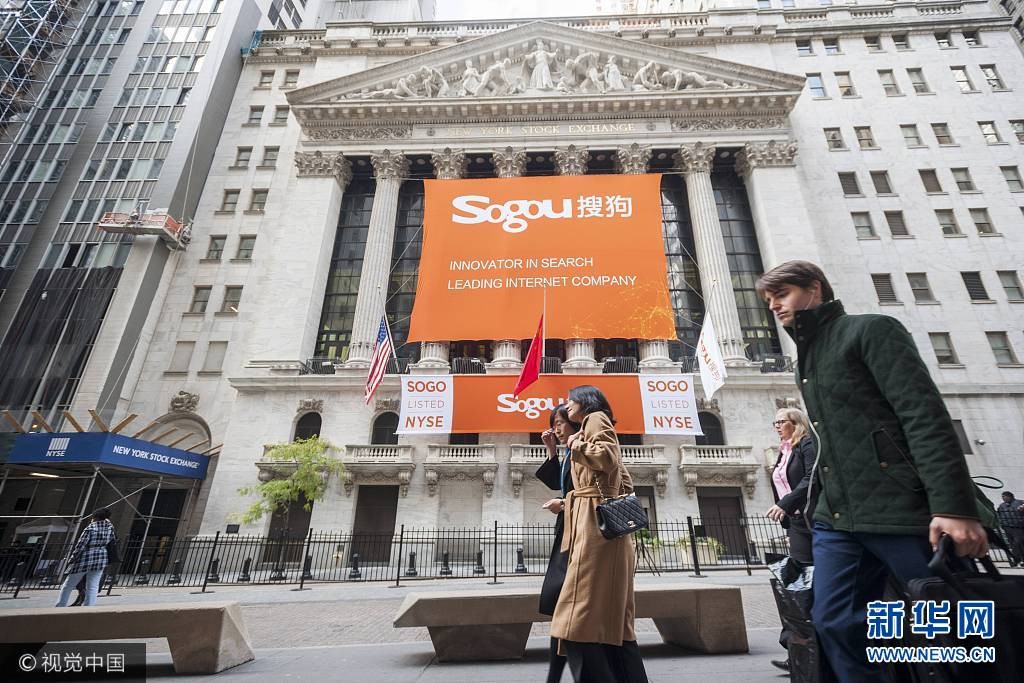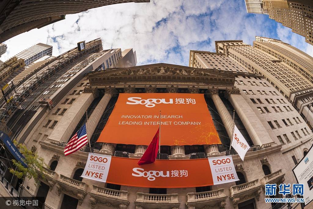 当地时间2017年11月9日,美国纽约,搜狗正式登美国纽交所,开盘价13美元与发行价持平,收盘报13.5美元,较发行价上涨3.85%。搜狗IPO发行价为13美元。本次搜狗IPO融资最高可达5.85亿美元。上个月,搜狗向美国证券交易委员会(SEC)上市申请书,计划在纽约证券交易所挂牌交易,股票代码为“SOGO”。本月初,搜狗将IPO发行价区间定为每股11美元至13美元,拟募资5.4亿美元。(图片来源:视觉中国)