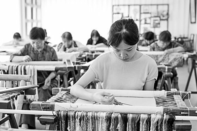 7月3日,在苏州高新区苏绣小镇里的一家苏绣工作室,绣娘们在加工苏绣产品。 新华社记者 李博摄