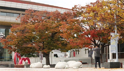 11月10日,一名男子在韩国釜山文化会馆附近拍摄秋景。 新华社记者 姚琪琳 摄