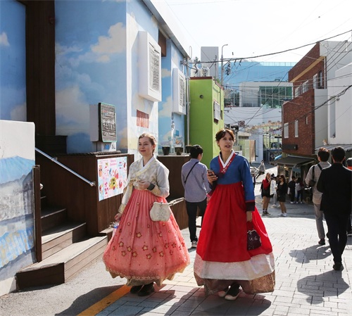 11月9日,游客在韩国釜山市的甘川文化村游玩。 新华社记者 姚琪琳 摄