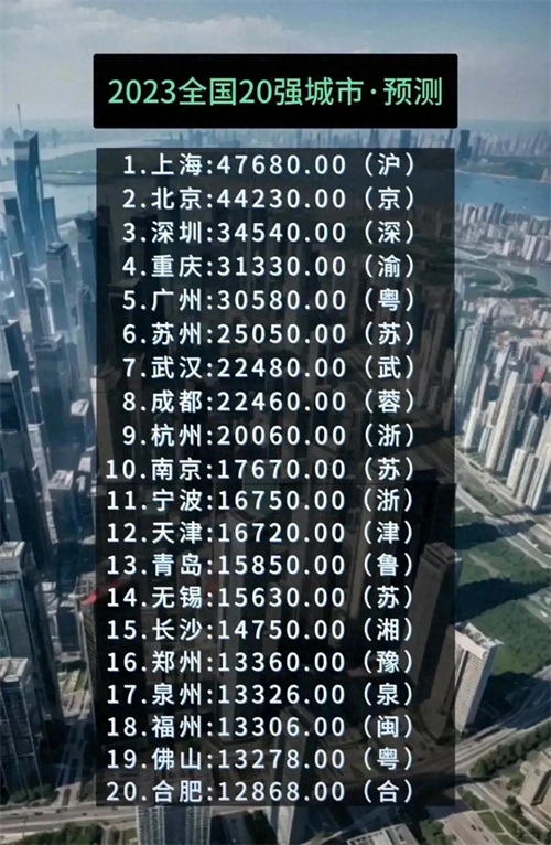 国内城市GDP总量20强预测,重庆第四, 成都第八,武汉与南京呢