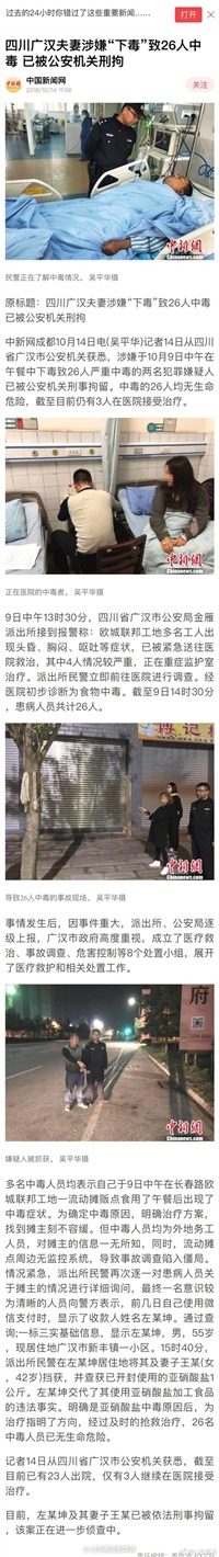 四川广汉夫妻涉嫌“下毒”致26人中毒 已被公安机关刑拘