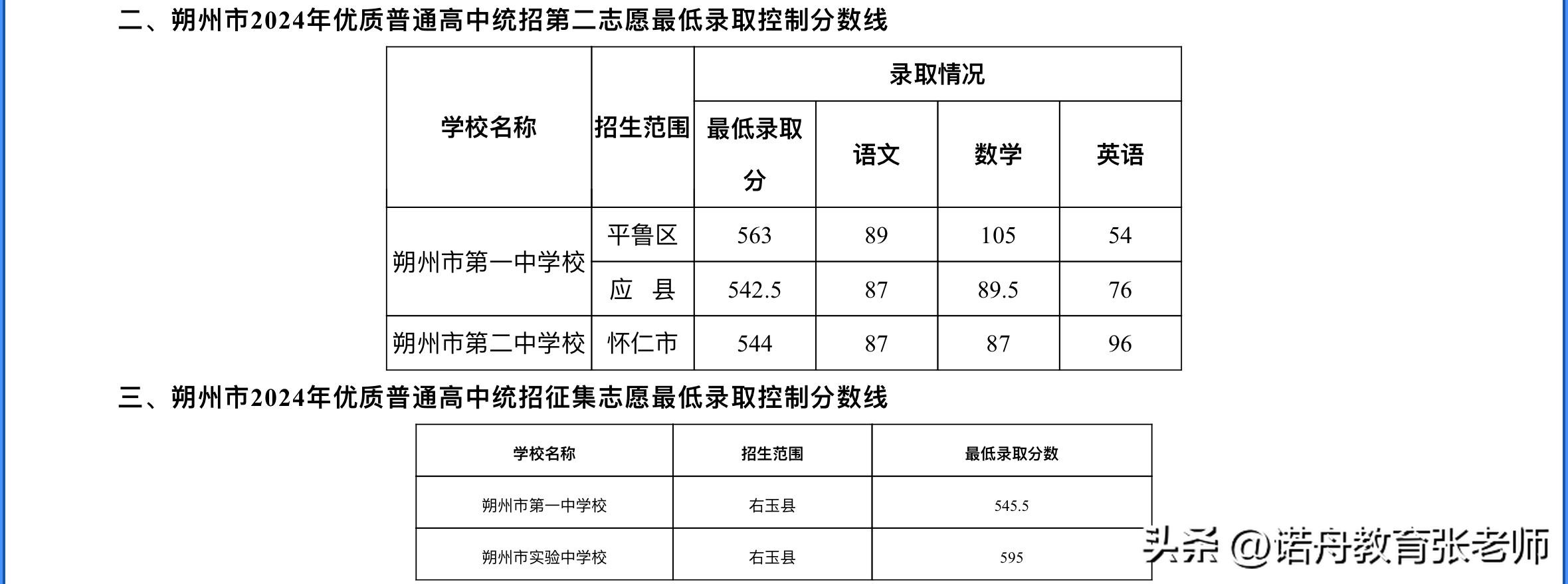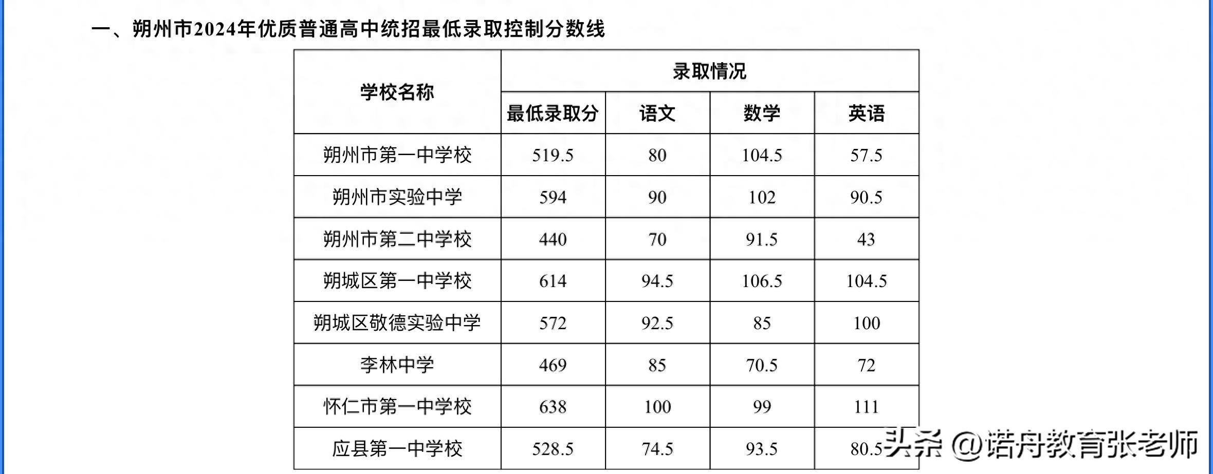 2024年7月14日,朔州市2024年高中统招最低录取分数线公布: