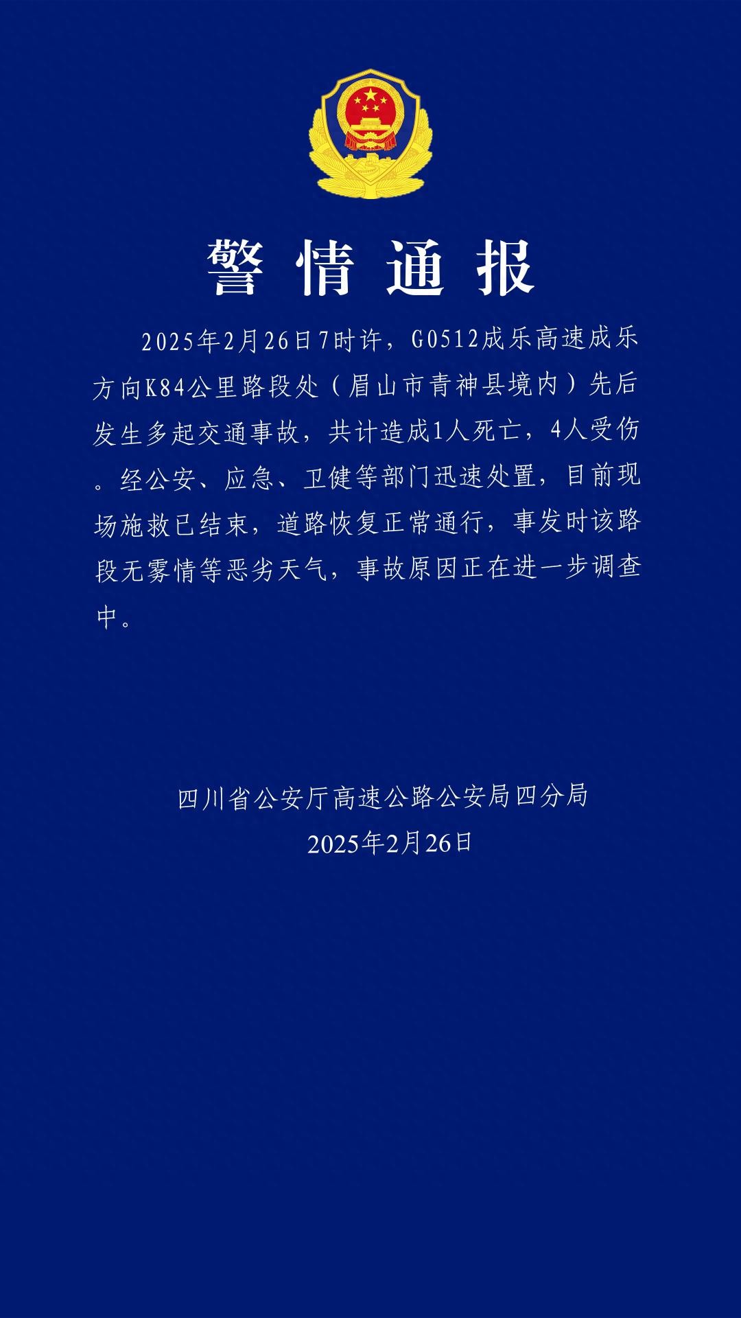 2月26日,四川高速公安四分局发布警情通报: