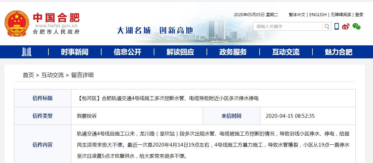近日,有网友在合肥市12345政府服务直通车上反映合肥轨道交通4号线施工多次挖断水管、电缆导致附近小区多次停水停电问题。