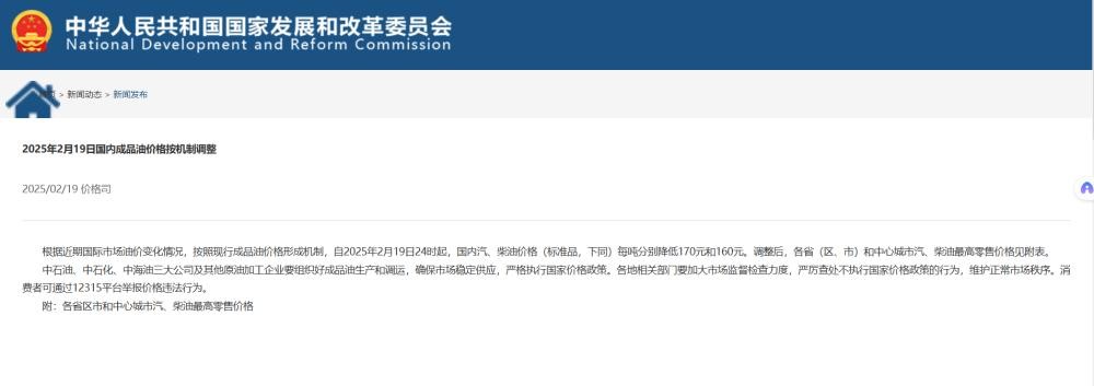根据近期国际市场油价变化情况,按照现行成品油价格形成机制,自2025年2月19日24时起,国内汽、柴油价格(标准品,下同)每吨分别降低170元和160元。调整后,各省(区、市)和中心城市汽、柴油最高零售价格见附表。