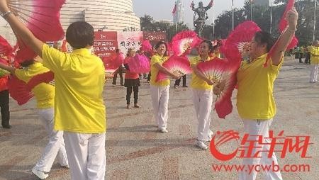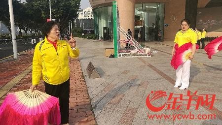 梅花艺术团的长扇舞,biubiu甩起来!艺术团团长梁阿姨表示,团员们七点半就到了星海音乐厅附近广场,整个赛事过程中加油助威活动都不会断,会轮番上场舞舞舞。采访过程中,梁阿姨也不断在对团员指点“动作大一点,扇子舞起来!