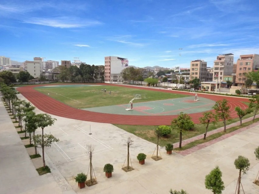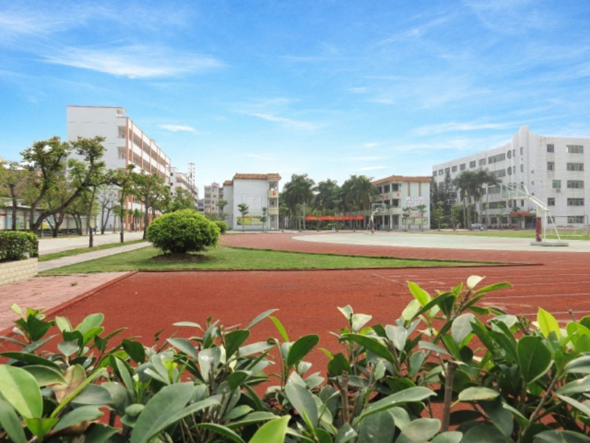 学校绿树成荫,花木繁茂、校道平整靓丽,校舍俨然一新,环境优美,设施完善。校园占地面积53亩,绿化占地21532平方米,绿化覆盖率达61%。校舍建筑面积19275平方米,生均建筑面积15.8平方米,现有教学楼3幢,科学馆、学生饭堂各1幢,学生公寓2幢,教工宿舍1幢,7个篮球场,3个羽毛球场,2个排球场,1个标准足球场,1个300米环形塑胶跑道