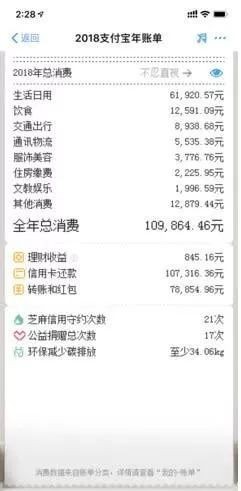 这份账单详细记录了用户在2018年花了多少钱,花在了哪里,具体包括服饰美容、生活日用、饮食、交通、运动健康、通讯物流等等。