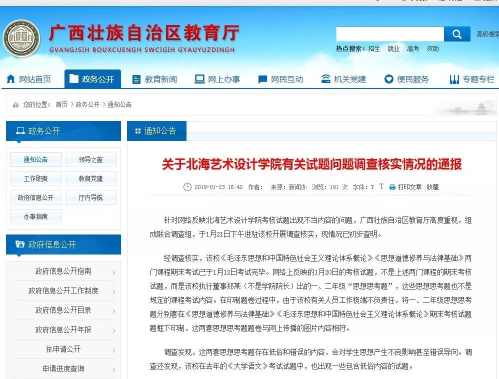 针对网络反映北海艺术设计学院考核试题出现不当内容的问题,广西壮族自治区教育厅高度重视,组成联合调查组,于1月21日下午进驻该校开展调查核实,现情况已初步查明。
