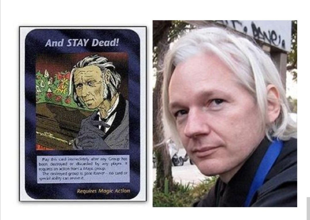 这张卡片名字叫“一直死着吧!”大部分人都认为这张是预告朱利安·阿桑奇的死亡结局,大部分人可能不知道阿桑奇是谁,朱利安·阿桑奇是著名爆料网站《维基解密》创办人、首席编辑与发言人。