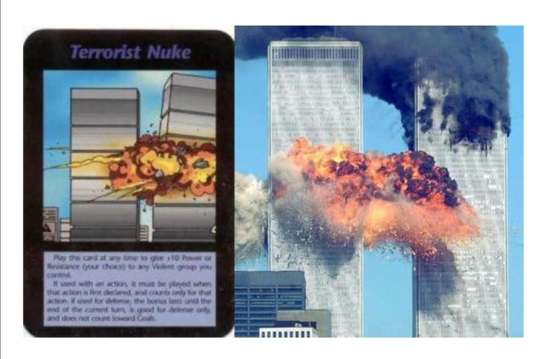 下面这种是叫恐怖核弹的纸牌,竟然与随后发生的911恐怖袭击事件画风异常相似巧不巧!