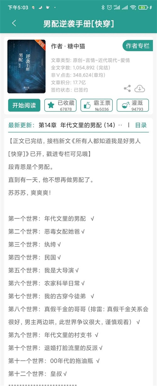 简评:快穿文,男主到各个小世界拯救女配的故事。男主塑造极佳,每个小世界都各有特色,或沙雕,或温柔,或严肃,或清朗,非常治愈,每个女主也都非常可爱,值得一看