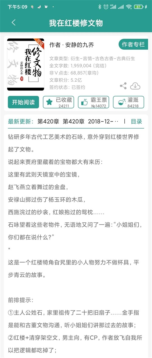 简评:不太一样的清穿,男主穿到清朝,意外有了与文物沟通的能力,穿插了一点九龙夺嫡的戏份,总体温馨治愈,作者文笔很棒,不会让人觉得平淡,越品味越悠长