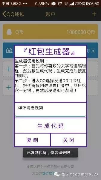 软件名称:QQ假红包生成器 软件大小:892.37KB 运行平台:安卓 软件说明:本软件由iapp编写,所以全被安全软件误报。作者也把软件免杀了,但免杀版无法在5.0系统的手机上安装,安装非免杀版即可。 软件介绍:最新假口令红包代码,安卓手机领不了,但是苹果手机和抢红包软件均可领取。 新版好处:对那些什么把表情删掉换行就能领红包的破解方法全部没用。 作者版权:QQ假红包生成器是一款完全免费的应用,本应用由imi蓝天独立开发。任何人不得以任何方式交易本应用!不得擅自对其进行修改版权、再次编译、破解等侵犯版权的行为!