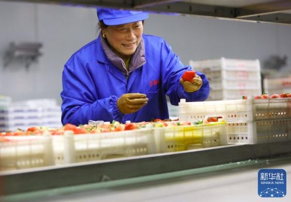 近日,辽宁省丹东市早熟草莓抢鲜上市,人们忙着采收新鲜草莓,打包后发往国内外市场。