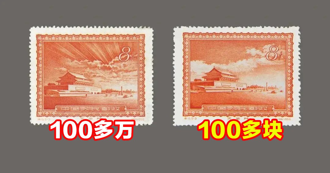 那时因为你的天安门没有放光芒呀,发行之初有人提出,天安门图案上的放光芒有点像炸弹爆炸,不够祥和,因此被取消发行并销毁,有少部分流出,后又从新补发了不带光芒的天安门邮票,两张价格真是天上地下,各位藏友收藏时一定要擦亮眼睛看清楚啊!