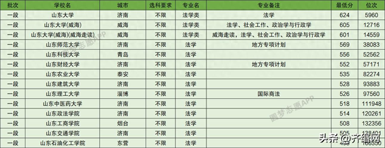 山东省内、且招收法学专业的大学名单,一共有14所,将其按照最低分排序得出的排名如下:(由于文章字数限制,仅展示10所)