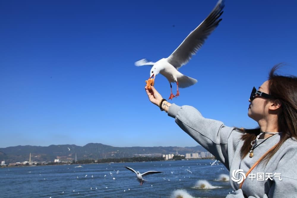 中国天气网讯 每年11月至次年3月,成千上万只海鸥从西伯利亚飞跃几千公里到云南昆明滇池过冬。海鸥所到之处,皆是一片欢声笑语,众多游客慕名而来,滇池周边、翠湖公园处处都是人与海鸥和谐相处的动人画面。尤其是在昆明蓝天的照应下、绚丽的日出和黄昏的彩霞中更是美不胜收。(图文/詹正杰)
