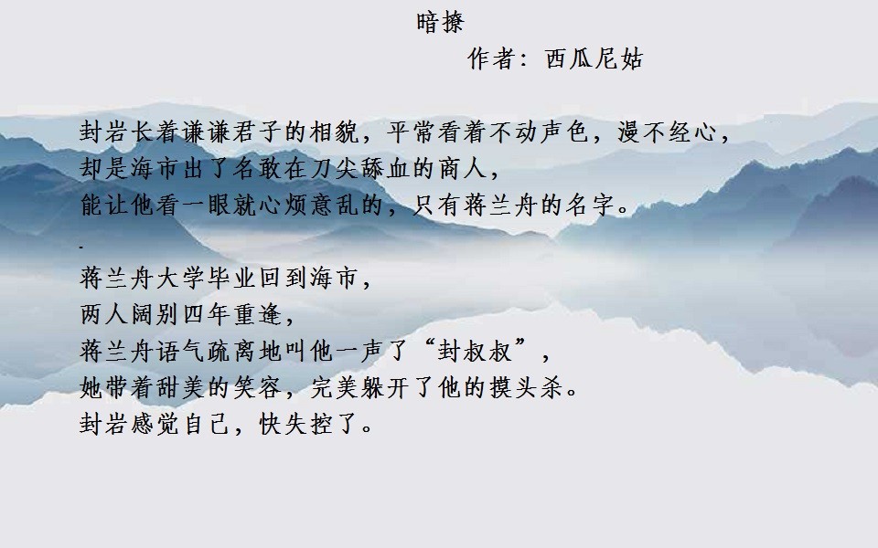 文很好,男主大女主20岁,不过把男主刻画的很年轻。女主爱,男主躲,等女主不想爱了,男主又开始后悔,开始找女主。不介意年龄差这么多的强推。