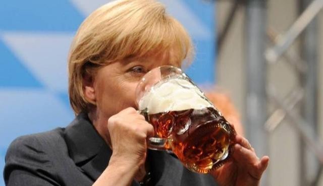 图四是德国总理默克尔,她是出了名好酒量,一大杯黑啤酒直接吹了,看来德国人喝酒跟中国人一样,喜欢直接干杯。
