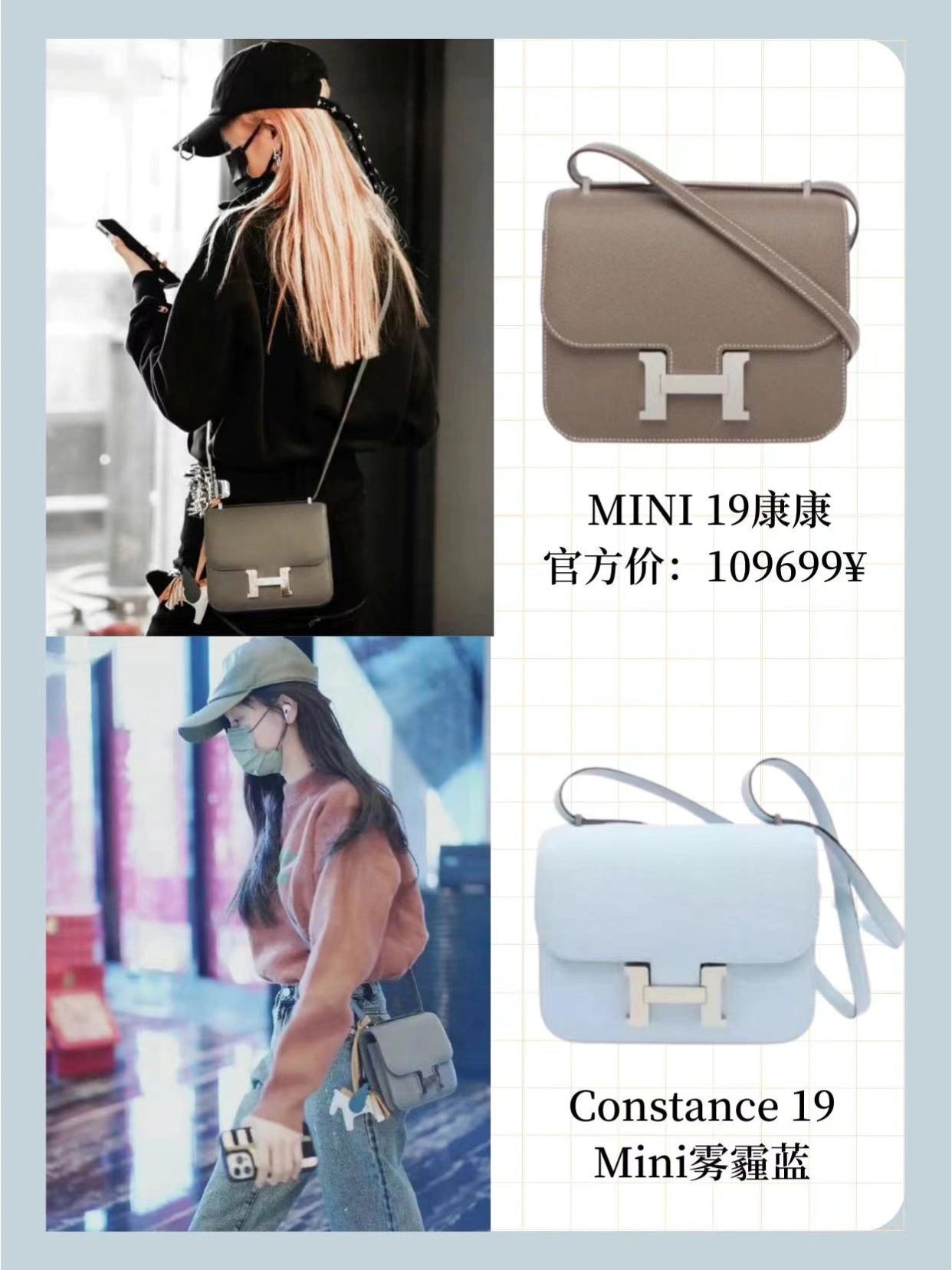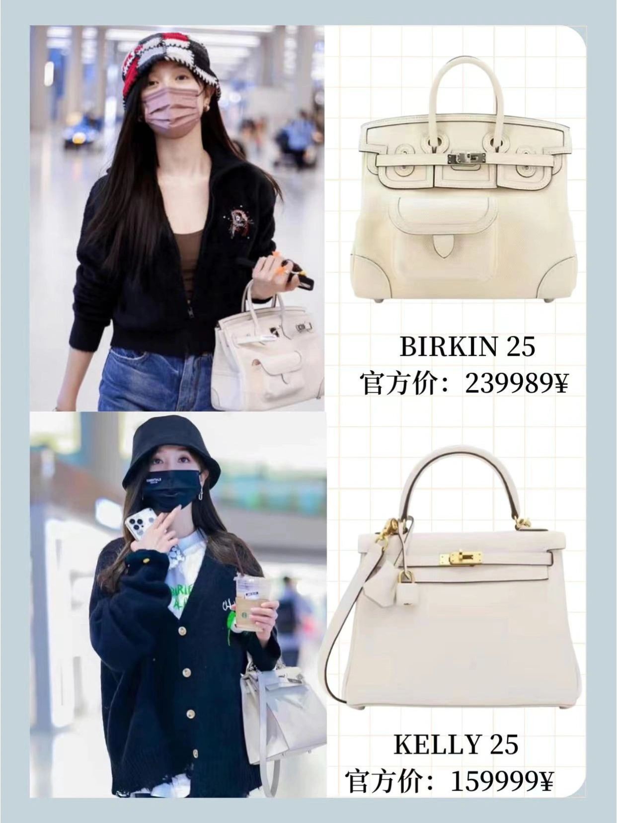 最常背的就是这只白色kelly,和她很多穿搭都能融合在一起,Birkin cargo、菜篮子都是偏向实用风的,功能齐全,性价比高,这几年大火的伊芙琳,小选也是轻松拿下,扁扁的包身斜挎起来刚刚好