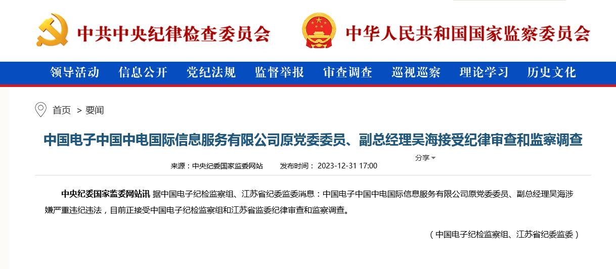 大皖新闻讯12月31日,中央纪委国家监委网站发布消息,中国电子中国中电国际信息服务有限公司原党委委员、副总经理吴海涉嫌严重违纪违法,目前正接受中国电子纪检监察组和江苏省监委纪律审查和监察调查。
