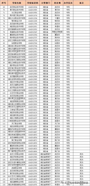 根据教育部最新发布的高校名单(截止至2024年6月20日),湖北省高校共计有133所,其中本科68所,专科65所。