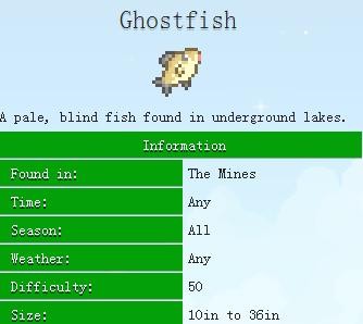 鬼鱼ghostfish又幽灵鱼称是一种只能在矿洞中每10层的宝箱洞中的湖里钓到的特殊鱼,这种鱼除了矿洞中任何地方都是没有的
