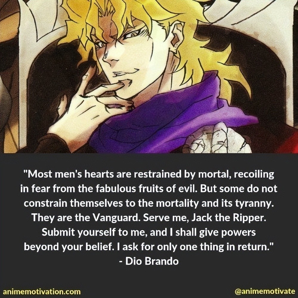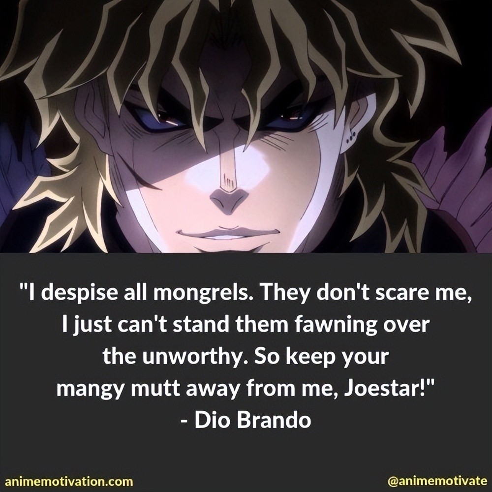 “我鄙视所有杂种。 他们吓不倒我,我只是受不了他们对不值得的人阿谀奉承。 所以让你那只肮脏的杂种狗离我远点,乔斯达!” – 迪奥