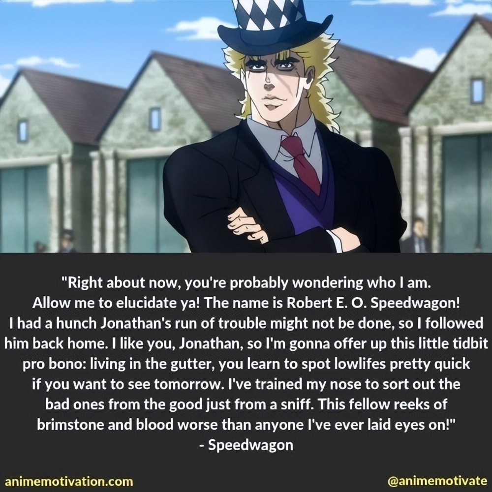 “现在,你可能想知道我是谁。 让我来解释你! 名字是 Robert EO Speedwagon! 我预感乔纳森的麻烦可能不会结束,所以我跟着他回到了家。 我喜欢你,乔纳森,所以我要无偿提供这个小消息:生活在阴沟里,如果你想看到明天,你会很快学会发现低等人。 我已经训练了我的鼻子,只要闻一闻就能分辨出坏的和好的。 这家伙浑身散发着硫磺和血腥味,比我见过的任何人都难闻!” – 史比特瓦根