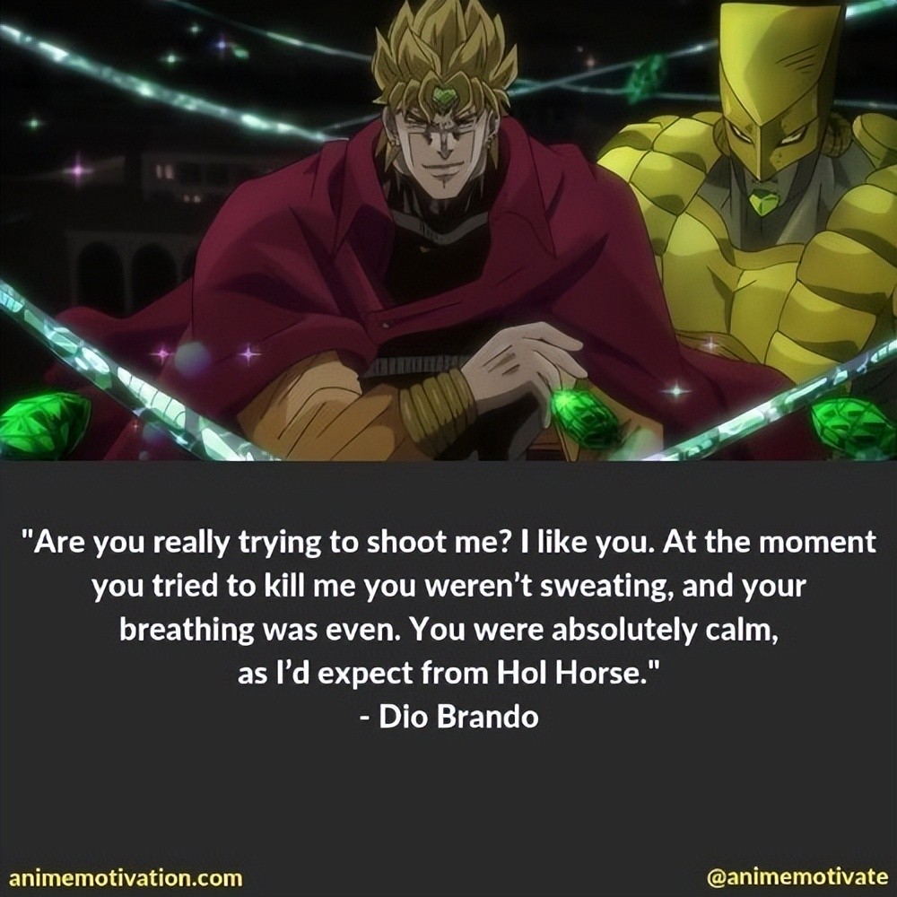 “你真的要射杀我吗? 我喜欢你。 在你想杀我的那一刻,你没有流汗,呼吸也很均匀。 正如我对 Hol Horse 的期望,你绝对冷静。” – 迪奥