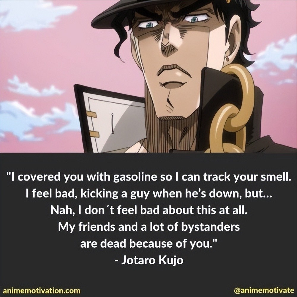 “我用汽油盖住你,这样我就能闻到你的气味。 我感觉很糟糕,在一个人情绪低落时踢他,但是……不,我对此一点也不感到难过。 我的朋友和很多旁观者都因为你而死。” ——九条承太郎