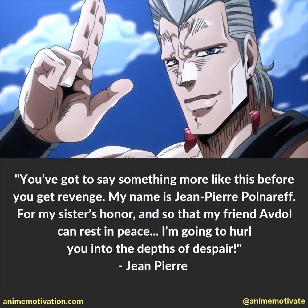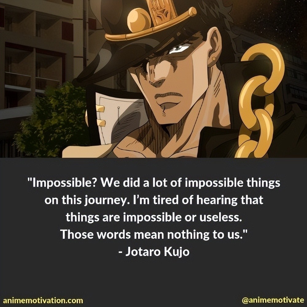 “不可能的? 在这段旅程中,我们做了很多不可能的事情。 我厌倦了听到事情是不可能的或无用的。 这些话对我们来说毫无意义。” ——九条承太郎