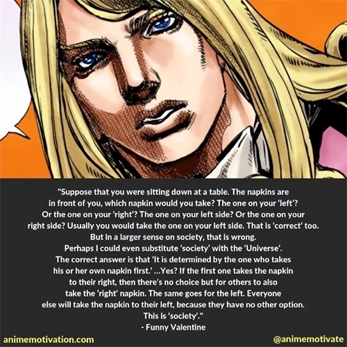 “假设你坐在一张桌子旁。 餐巾在你面前,你会拿哪一张? 你“左边”的那个? 还是你“右边”的那个? 你左边那个? 还是你右边那个? 通常你会拿你左边的那个。 那也是“正确的”。 但从更广泛的社会意义上讲,这是错误的。 也许我什至可以用“宇宙”代替“社会”。 正确答案是“由谁先拿自己的餐巾纸决定”。 …是的? 如果第一个拿了右边的餐巾,那么别无选择,只能让其他人也拿“右边”的餐巾。 左边也一样。 其他人都会把餐巾拿到他们左边,因为他们别无选择。 这就是‘社会’。” – 法尼·瓦伦泰(Funny Valentine)