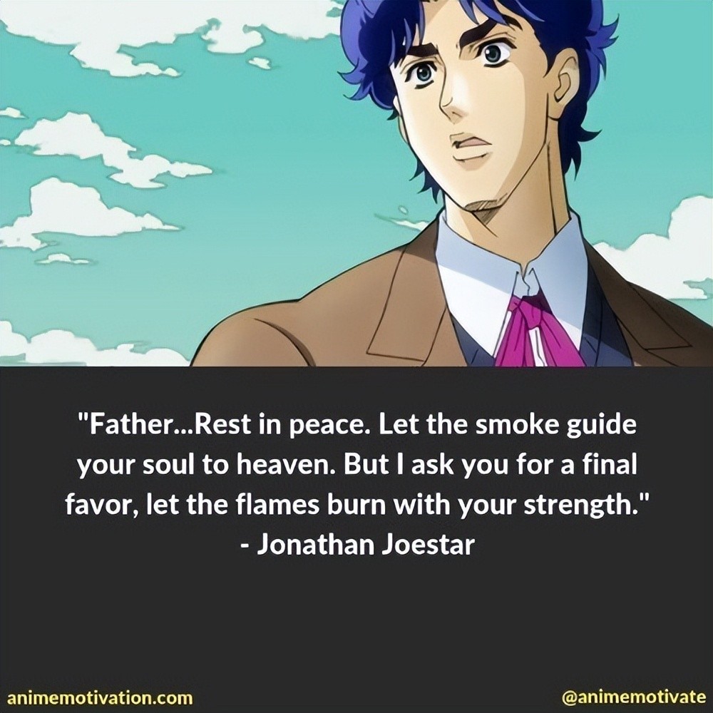 “父亲……安息吧。 让烟雾将你的灵魂引向天堂。 但我请求你最后的帮助,让火焰以你的力量燃烧。” – 乔纳森·乔斯达