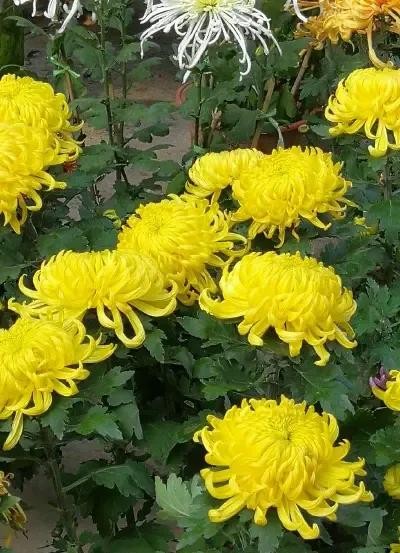 满园花菊郁金黄,中有孤丛色似霜。