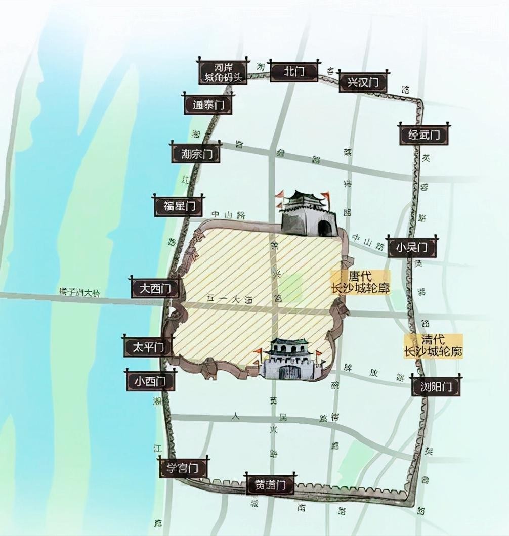 就长沙古城的范围来看,唐宋时,西濒湘江的长沙城已南扩至南门口,北至湘春门,东至浏阳门(浏城桥)。明代长沙已成为人口密集、工商业繁荣的商埠。砖土建筑的城墙,改筑石基。大致宽五里,长十里。到了清初,长沙城墙增厚加高,多次整修。