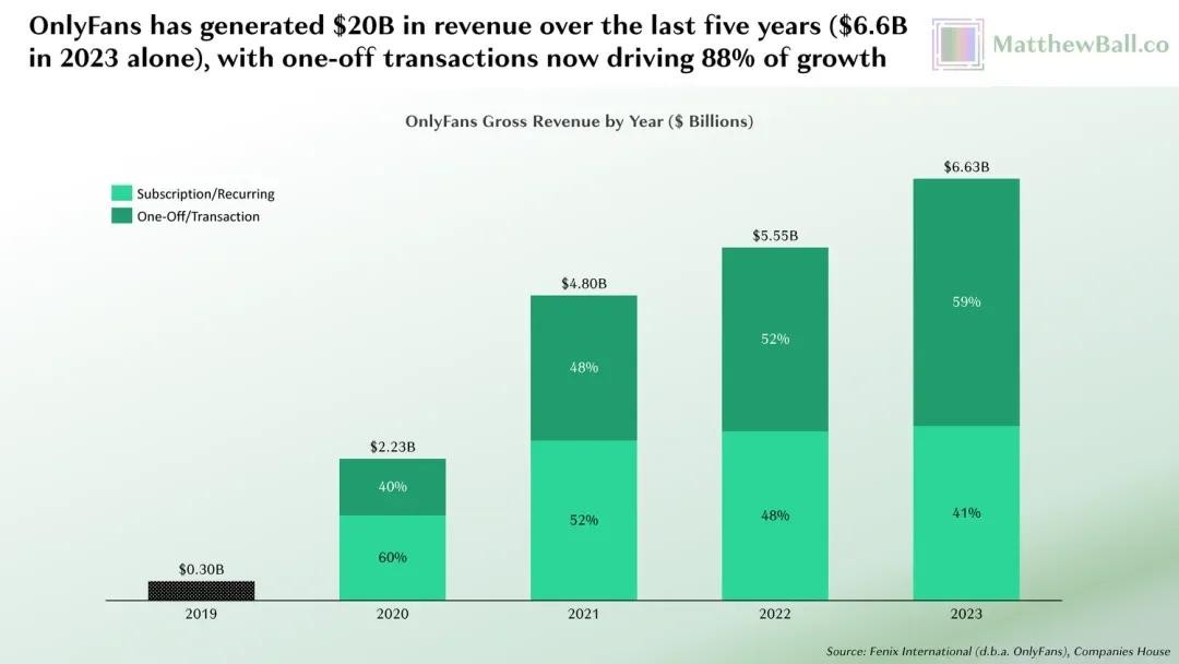 依靠一种人类原始的冲动,Onlyfans不仅有各种自发而来的需求和流量,并且一年收入可达惊人的66亿美元,赚钱如喝水一般简单。