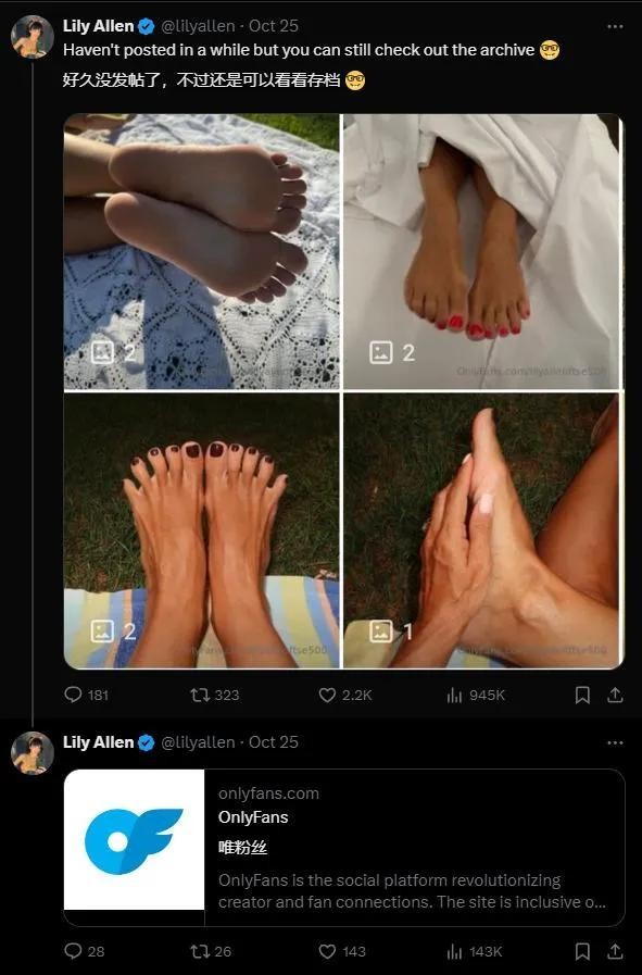 她在社交账号上传了多张她的脚部特写照片,并带上其OnlyFans主页的链接,希望更多人关注她的onlyfans。