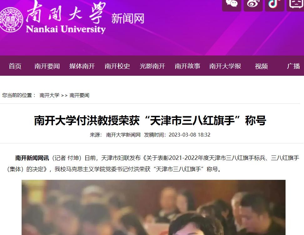 南开大学新闻网:《南开大学付洪教授荣获“天津市三八红旗手”称号》发布时间:2023.3.8
