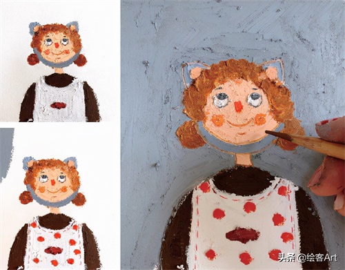 04.脸颊的腮红和头发的暗部用红色和橙色迷你油画棒交替上色, 呈现出脸部的立体感。