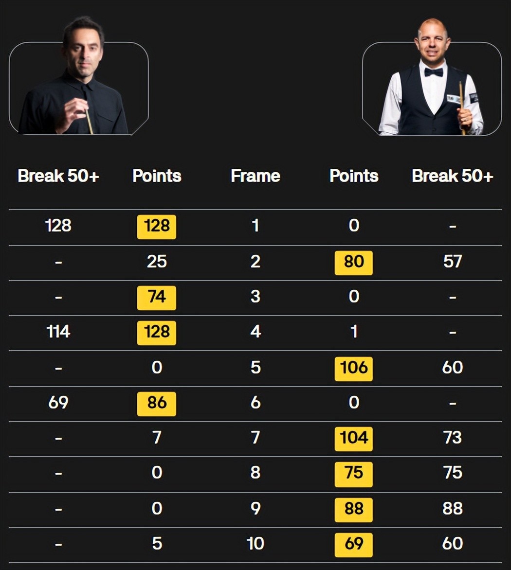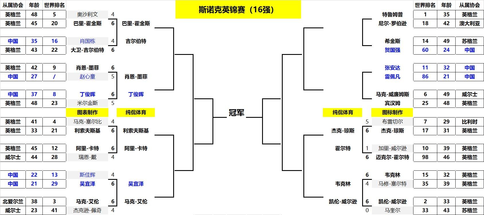 综上不难看出,丁俊晖和吴宜泽两名球员晋级16强,斯佳辉、肖国栋、赵心童止步于正赛首轮,遗憾出局。而在已经结束的3个比赛日,其余场次正赛首轮结果为: