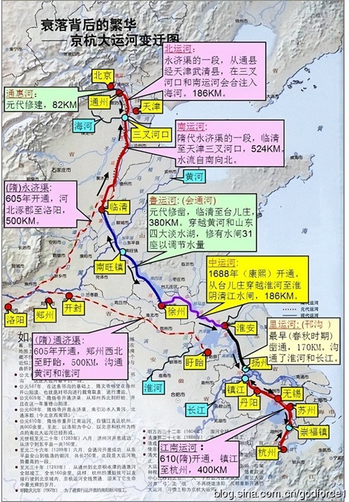 隋朝大运河以洛阳为中心,通过通济渠、永济渠、江南运河等,连接了海河、黄河、淮河、长江、钱塘江五大水系。这一庞大的运河体系不仅加强了隋朝对南北方的政治、军事控制,便利了全国财物向洛阳、长安的集聚,而且大大加强了我国南北东西的政治、经济、文化联系。