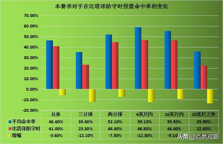 分析完比塔泽的拼抢数据,接着再看比塔泽对于对手投篮命中率的限制。从整体上可以看出,比塔泽对于对手投篮命中率的限制做的非常出色。对手在其防守下,整体命中率下降了5.6%。具体来看,比塔泽对于对手三分投篮命中率的限制最为出色,对手在其防守下投篮命中率下降了12.1%。可见只要对手在三分线外投篮前,比塔泽能对其作出有效的防守,那么对手的三分命中率就会急剧下滑。