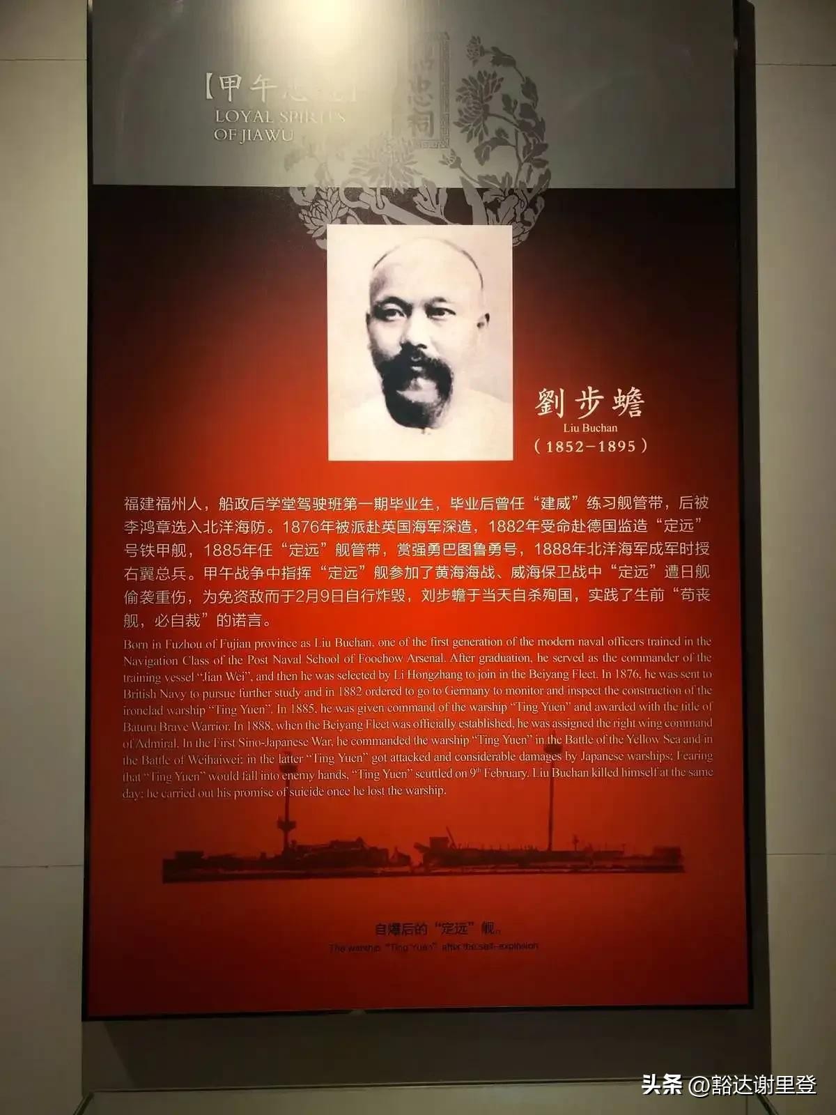管带刘步蟾威海卫之战中,拒绝降敌,顽强拼战,弹尽援绝,在定远舰自爆当夜,吞服大量鸦片自杀殉国,与舰共存亡,时年43岁。
