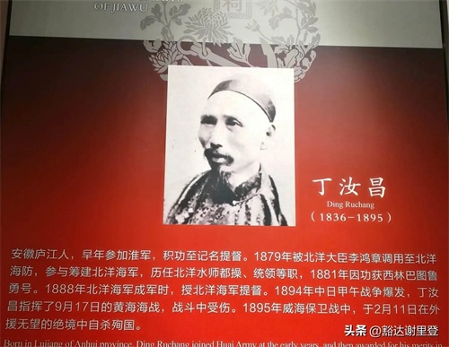 水师提督丁汝昌,在威海卫之战中,指挥北洋舰队坚持抵抗日军的围攻,并严词拒绝了日本联合舰队司令长官伊东祐亨的劝降和北洋海军洋员英国人马格禄等的逼降,后见援兵无望,1895年2月12日服毒自尽。时年59岁